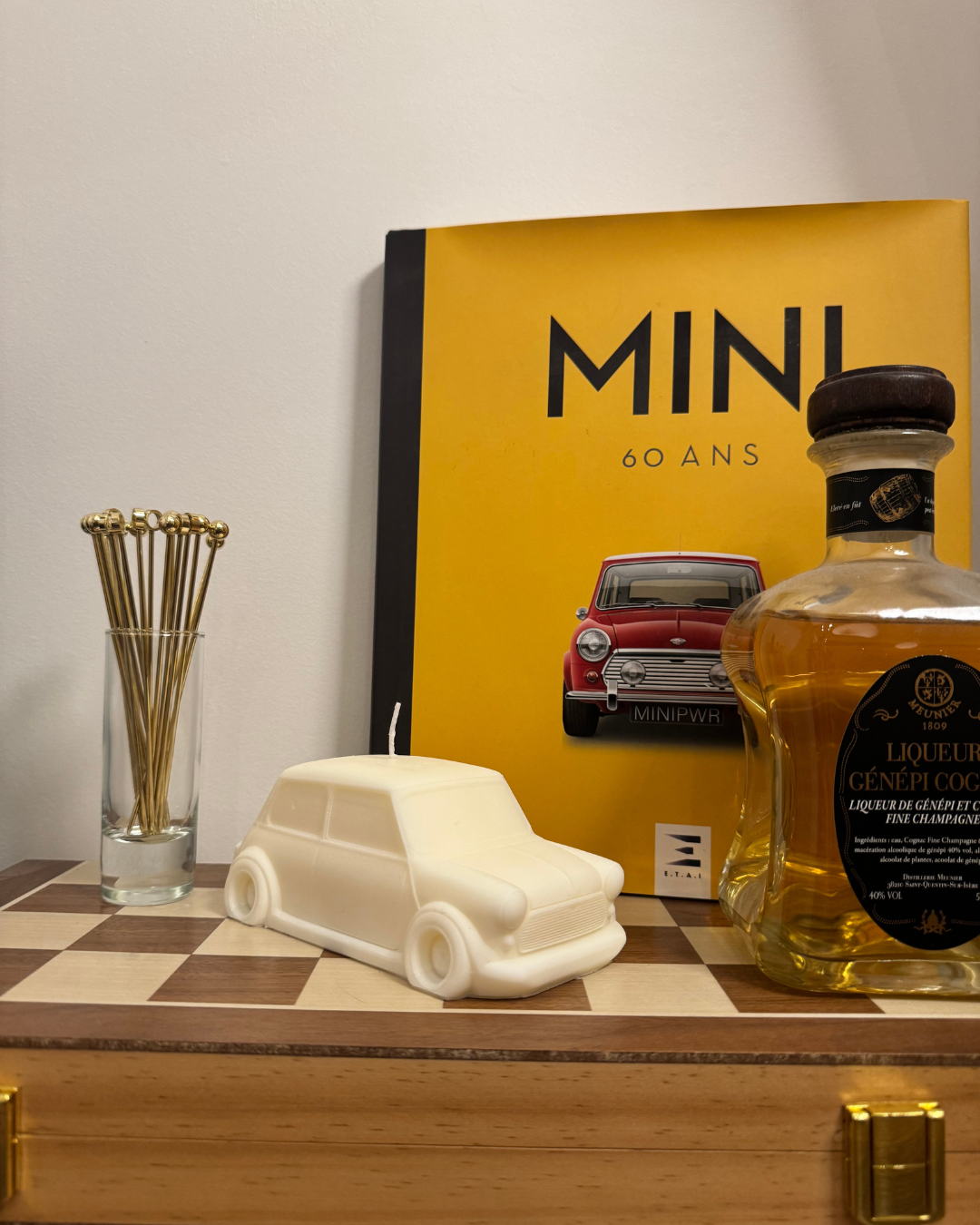 Illuminez votre intérieur avec notre bougie en cire de soja inspirée de la légendaire Mini Austin, fabriquée à la main en France.